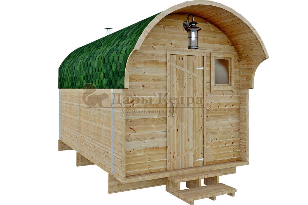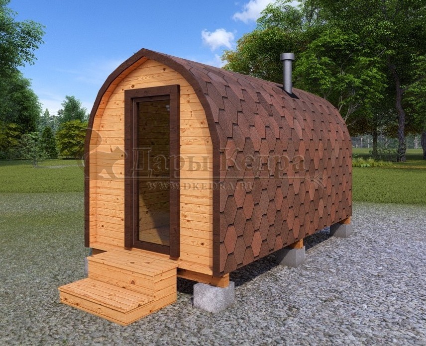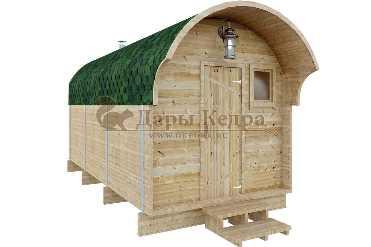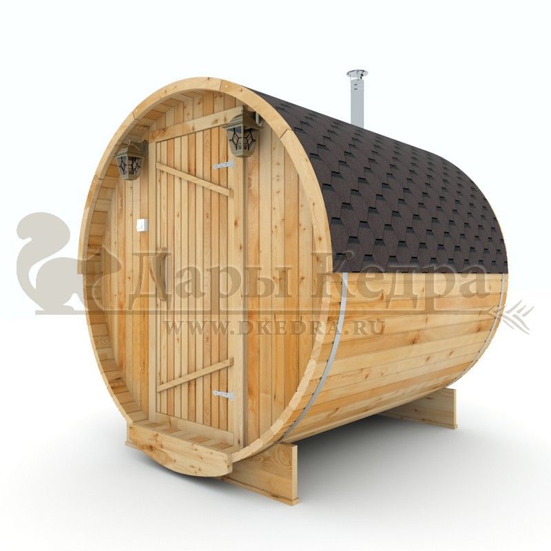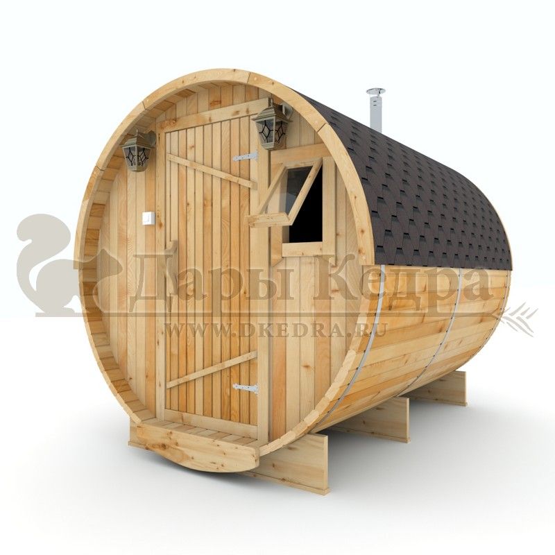 Баня-бочка буханка из кедра 3,5 метра Это более просторная модель за счет увеличенной высоты потолков и ровного пола. В такой модели раздевалка совмещена с моечной. Тут установлен душевой поддон, вешалка, полочка и лавочка из кедра. В парильном отделении по обе стороны расположены двухуровневые открытые полки, печь находится между ними у дальней стены. Время растопки такой бани не превышает 30 минут. По вашему желанию баню-бочку можно укомплектовать козырьком, верандой и печью с внешней загрузкой, благодаря которой весь мусор во время топки остается на улице. Баня-бочка буханка не требует полноценный фундамент, поэтому при необходимости ее можно перенести в другое место. Обращаем Ваше внимание, что в стандартную комплектацию бани входят полки открытого типа в парной с обеих сторон. Дополнительно можно заказать полок закрытого типа или лавку! Кедр обладает ароматическими свойствами. Он не деформируется и влагоустойчив, при правильном уходе за деревом на нем не развиваются грибки и плесень. , ,