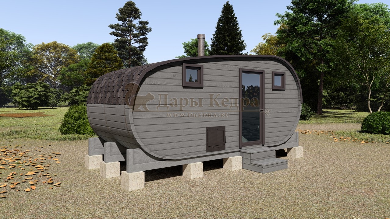 Баня-бочка буханка из кедра 3 метра Это более просторная модель за счет увеличенной высоты потолков и ровного пола. В такой модели раздевалка совмещена с моечной. Тут установлен душевой поддон, вешалка, полочка и лавочка из кедра. В парильном отделении по обе стороны расположены двухуровневые открытые полки, печь находится между ними у дальней стены. Время растопки такой бани не превышает 30 минут. По вашему желанию баню-бочку можно укомплектовать козырьком, верандой и печью с внешней загрузкой, благодаря которой весь мусор во время топки остается на улице. Баня-бочка буханка не требует полноценный фундамент, поэтому при необходимости ее можно перенести в другое место. Обращаем Ваше внимание, что в стандартную комплектацию бани входят полки открытого типа в парной с обеих сторон. Дополнительно можно заказать полок закрытого типа или лавку! Кедр обладает ароматическими свойствами. Он не деформируется и влагоустойчив, при правильном уходе за деревом на нем не развиваются грибки и плесень.