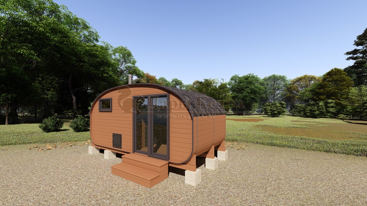 Баня-бочка «Орео» с боковым входом и панорамным окном Стильная и современная баня-бочка с боковым входом может быть выполнена длиною от 4 метров, что-бы было два отделения (парилка и комната отдыха). Полок может быть, как с двух сторон, так и угловой, в стандарте одноуровневый. Печь в данной модели расположена сбоку с топкой наружу, либо внутрь парилки. Печь можно укомплектовать баком для воды, а саму баню сделать длиною до 6 метров, комфортно разместив в ней дополнительно помывочную. В эту модель включено два закаленных стеклопакета: круглое и полукруг, которые мы можем разместить на ваше усмотрение в парилке и комнате отдыха. Обращаем Ваше внимание, по умолчанию в данной модели отсутствует бак для воды, вместо него идёт утеплённая термо-труба, которую можно заменить на бак по желанию.