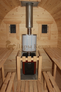 Это более просторная модель за счет увеличенной высоты потолков и ровного пола. В такой модели раздевалка совмещена с моечной. Тут установлен душевой поддон, вешалка, полочка и лавочка из кедра. В парильном отделении по обе стороны расположены двухуровневые открытые полки, печь находится между ними у дальней стены. Время растопки такой бани не превышает 30 минут. По вашему желанию баню-бочку можно укомплектовать козырьком, верандой и печью с внешней загрузкой, благодаря которой весь мусор во время топки остается на улице. Баня-бочка буханка не требует полноценный фундамент, поэтому при необходимости ее можно перенести в другое место.