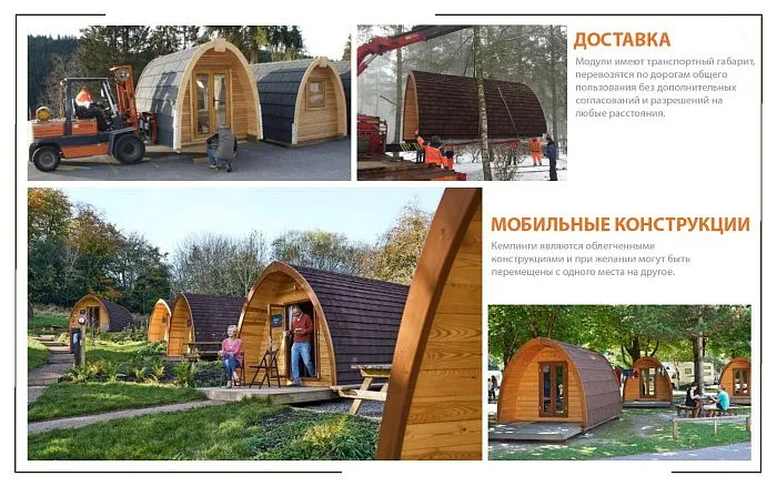По желанию собственника кемпинга возможно соединить несколько строений в один комплекс. Такая опция будет интересна большим семьям или организованным загородным досуговым центрам, базам отдыха, спа-комплексам и т.д.