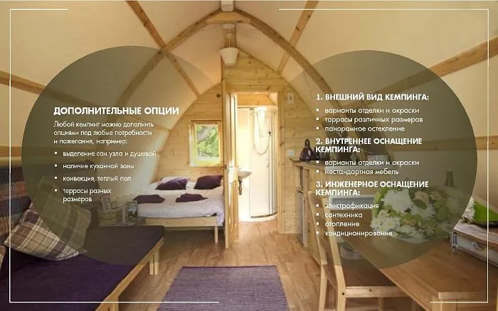Кемпинги производятся из хвойных пород дерева. Крыша изделия покрывается мягкой черепицей, выглядит красиво, практично. Для того, чтобы эко-постройка сохраняла тепло в холодное время года и не нагревалась летом, используется утеплитель - негорючая базальтовая плита (100 мм). Окна, двери изготовлены из пвх-профиля с двойным остеклением. Стандартная комплектация такого строения включает всё необходимое для эксплуатации в теплое время года. В стоимость уже включены полки, вешалки, стол, кровать. В помещении есть свет. По желанию владельца кемпинга можно дополнить конструкцию выделенной кухней, сан.узлом, душевой кабиной или ванной. Очень частой дополнительной опцией является установка кондиционера, особенно она распространена при эксплуатации домиков на базах отдыха, в санаториях. Любой полет фантазии клиента реализуемый, так как компания Дары Кедра является производителем мобильных каркасных и бань-бочек. Чтобы мобильная конструкция была в эксплуатации круглый год, в ней нужно установить теплый пол или печь. Дополнительный уют и красоту домику придадут террасы, веранды, их можно использовать в качестве дополнительного пространства для организации беседки, гриль-площадки и т.д.