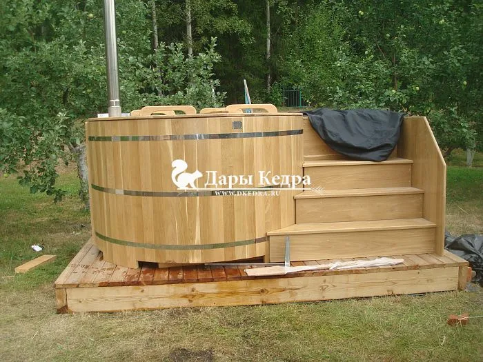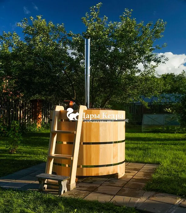 В компании Дары Кедра помимо купелей с внешней или внутренней печью имеются модели с электроподогревом воды, в этом случае электроподогрев служит только для поддержания температуры уже налитой воды в емкость. Рекомендуем использовать специальную крышку, которой накрывают бочку, чтобы сохранить тепло, она может быть деревянной или выполненной из термостойкого материала. Она же защищает баню от попадания мусора и пыли в перерывах между процедурами. Кроме того, Вы можете заказать индивидуальное исполнение. У нас в компании купель с подогревом Фурако изготавливается из древесины кедра или дуба.